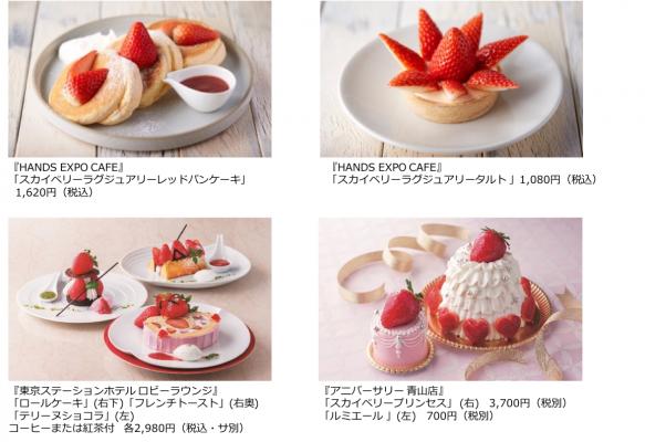 また、「東京ステーションホテル」、東京駅「GRANSTA(グランスタ)」で実施中の「スカイベリーフェア」のメニューと、「アニバーサリー 青山店」とのスペシャルコラボレーションメニューが並び、見て楽しい食べて美味しいフォトジェニックなスカイベリーを使ったオリジナルメニューをご紹介いたしました。