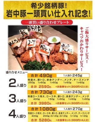 複数人でシェアすることで岩中豚の様々な部位が楽しめると人気のメニュー、「岩中豚一頭買い盛り合わせ(2人前/税込2,797円、3人前/税込4,298円、4人前/税込5,702円)」を期間中にご注文頂いたお客様には、通常価格税込324円の海老フライを人数分サービスさせて頂きます。