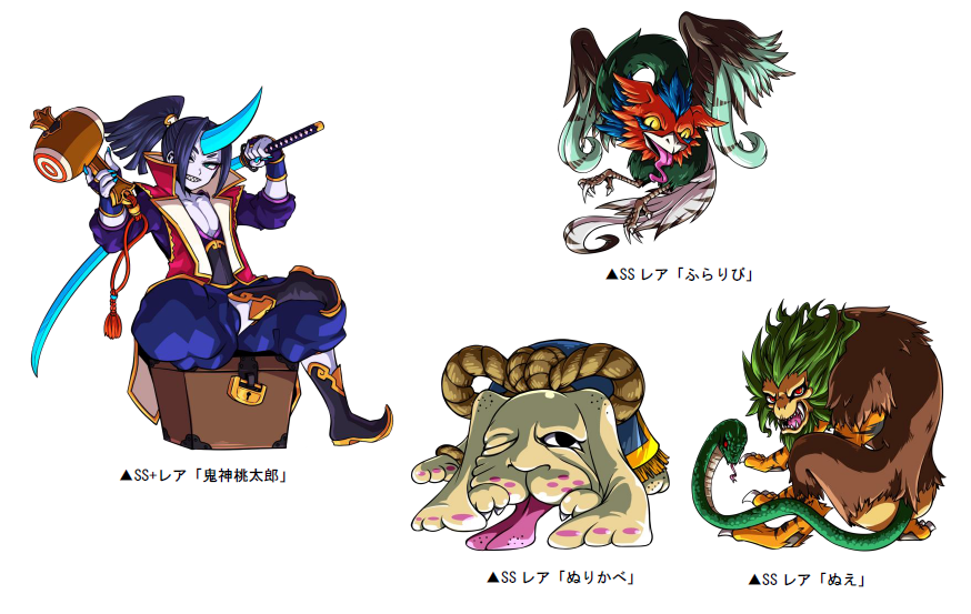 本ダンジョンをクリアした際に手に入る「鬼哭P」を貯めると、累計ポイントに応じてSS+レア「鬼神桃太郎」「ふらりび」「ぬりかべ」「ぬえ」を入手することができます。