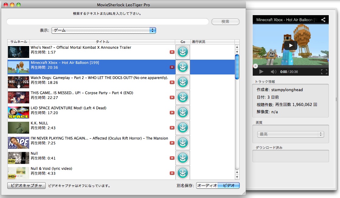 Mac YouTube ダウンロードソフトMovieSherlock(ムービーシャーロック)はYouTube(ユーチューブ)、DailyMotion(デイリーモーション)、ニコニコ、Vimeoなどの動画ダウンロードサイトの動画または音声をダウンロードして、Macで見れる形式にコンバートするソフトです。Webブラウザを使わないで、キーワードで検索できます。また、ビデオをカテゴリで表示できます。YouTubeの広告が表示されないように設定できます。動画をMP3形式に交換してiPodなどでオーディオを聞くこともできます。ほかのMac 動画ダウンロードソフトがダウンロードできない動画を短時間でダウンロードできます。