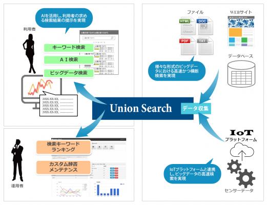 「Union Search」は、あらゆる種類のデータ形式において、データ量に依存せず横断的な検索を可能にするビッグデータ検索サービスです。これまで当社が培ってきたIoT関連技術やWEBシステム開発におけるビッグデータ活用のノウハウと、高精度な自然言語処理を用いたAIを活用することで、検索キーワードの意味を理解し、最適な検索結果を提示します。本サービスの導入には、検索対象データの授受やクローリング設計、検索機能設計が必要となり、導入期間として約1か月間を見込んでいます。