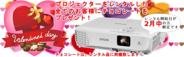 このたび株式会社ダイコー電機(代表取締役:中塚 雅子)では、1月31日(水)~2月28日(水)の期間内に「でんすけレンタル」(http://densuke.ne.jp/rental/)からプロジェクターをレンタルされた方全員(注)に、チョコレートをプレゼントする「でんすけレンタル バレンタインキャンペーン」を実施します。