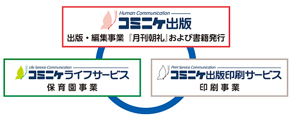 『月刊朝礼』の発行から始まったコミニケ出版の事業は、保育園事業、印刷事業と、活躍の幅を広げています。『月刊朝礼』を通して培った道徳教育の精神を、あらゆる事業に生かし、社会貢献につなげていくのが目標です。