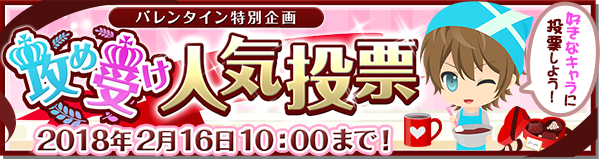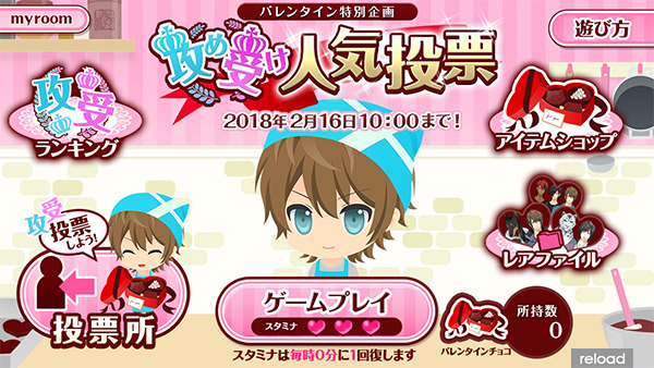 ミニゲームで投票券(バレンタインチョコ)を獲得して、好きなキャラクターに投票してください。