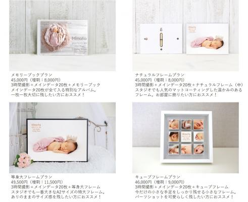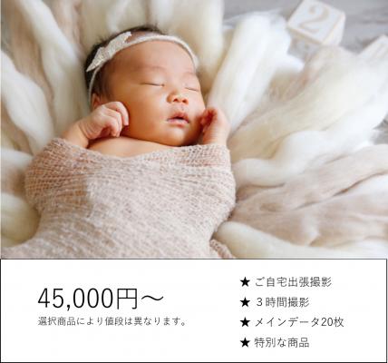 プレシュスタジオのニューボーンフォトは、「3時間撮影」「データディスク」「特別商品」のパッケージで45,000円~とリーズナブルな価格設定です。