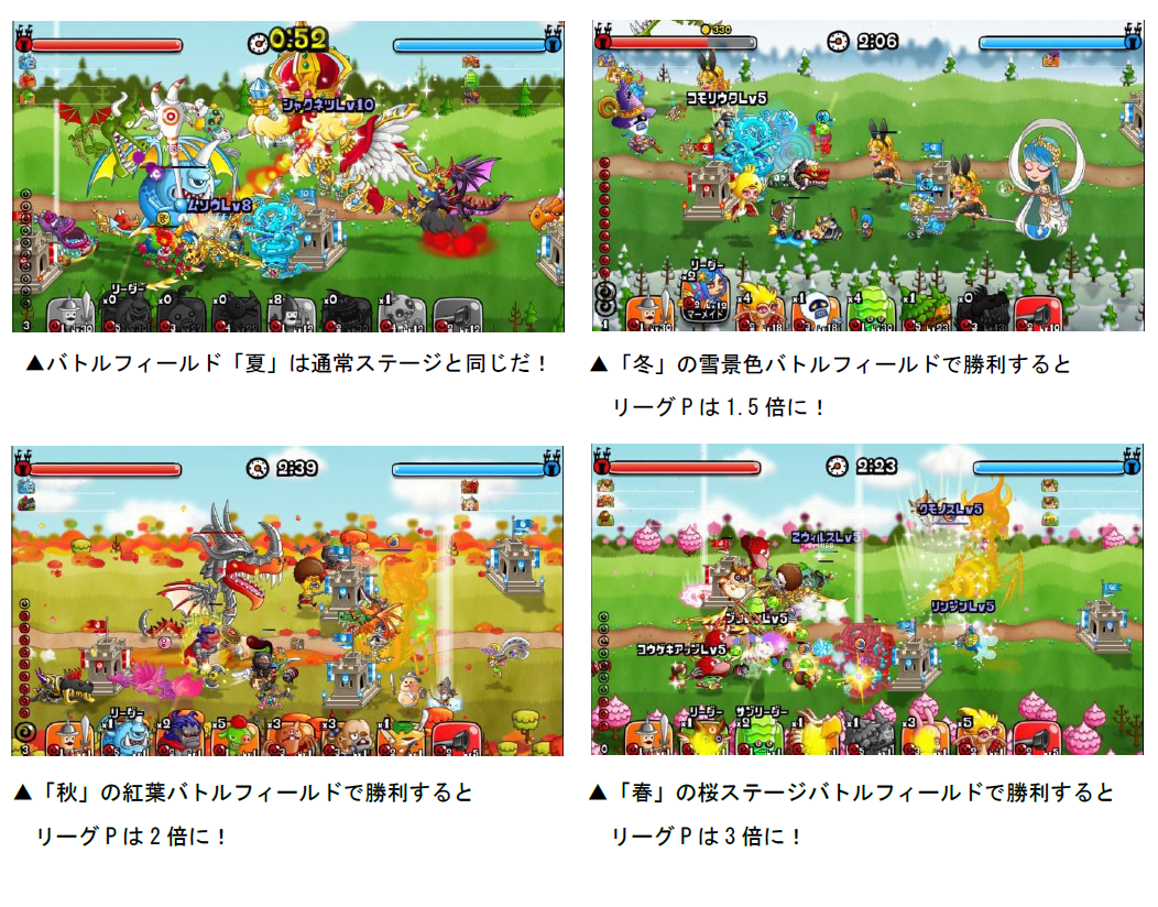 期間中、リーグでのバトルフィールドが「春」「夏」「秋」「冬」の中からランダムで選ばれる「春夏秋冬バトル」を開催します。バトルフィールドによって、勝利した時の獲得できるリーグPが増加するので、ボーナスの大きいバトルフィールドではチャンスを逃さないようにしましょう!