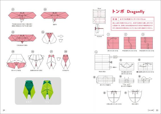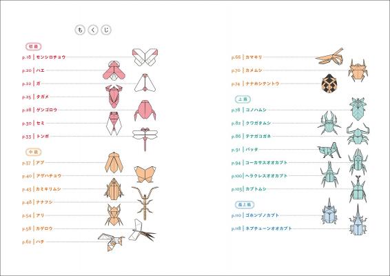 種類によってツノの形を表したさまざまなカブトムシほか、昆虫のおりがみ26種類を収録。