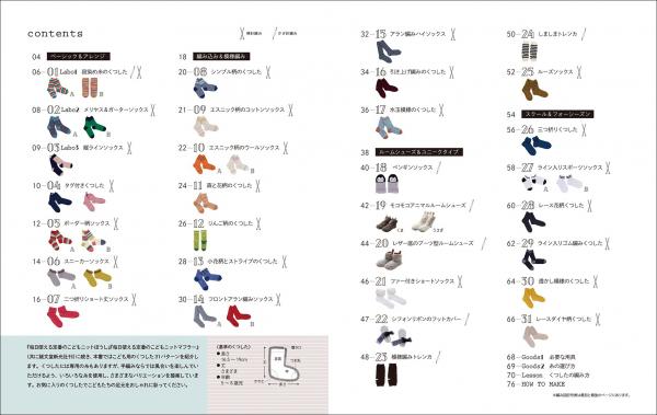 2~3日の短時間で作れる簡単な編み方を中心に、模様編み、編み込み、立体的な編み方など、さまざま編み方で色と模様を展開するくつしたが、たくさん登場します。