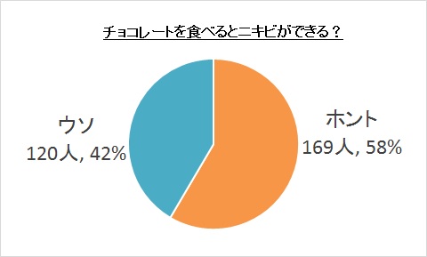 「チョコレートを食べるとニキビができる?」という質問に対して58%、約6割の人が「本当である」と認識しているという結果がわかりました。