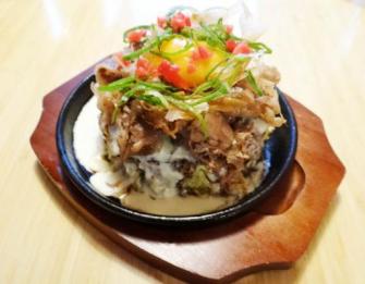 ソテーしたお肉をトッピング!さらに玉子を乗せて、羊の家名物のオリジナルチーズフォンデュ「クリームフォンデュソース」をかけてまろやかに仕上げた洋風お好み焼きです。