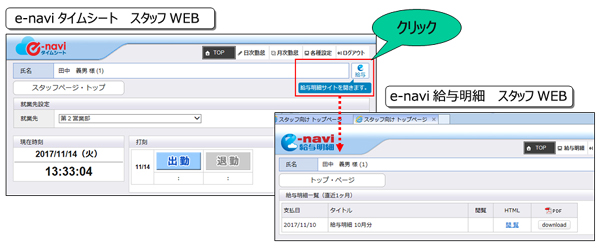 シングルサインオン機能により、e-naviタイムシートとe-navi給与明細を同時利用の場合、スタッフは一度のログインで両サイトを利用することができます。
