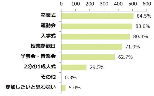 参加したいと思う子どもの学校行事を聞いたところ、最も多かったのが「卒業式(84.5%)」で、続いて「運動会(83.0%)」、「入学式(80.3%)」と続きました。また「2分の1成人式」に参加したいと回答した方も29.5%にのぼりました。