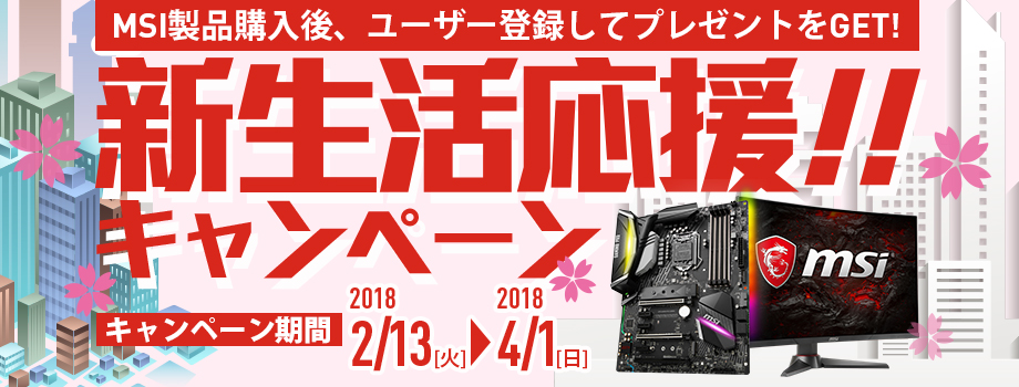 2018年2月13日-Micro-Star International Co. Ltd., 台湾・新北市- GAMING向けハードウェアの設計で世界をリードするMicro-Star International(MSI)は、Intel Z370/AMD X370/AMD B350チップセット搭載マザーボードと湾曲型ゲーミングモニターOptixシリーズをご購入された方にSteamウォレットコードをプレゼントする「新生活応援!!キャンペーン」を2月13日から4月1日まで実施いたします。