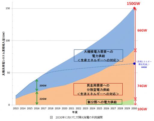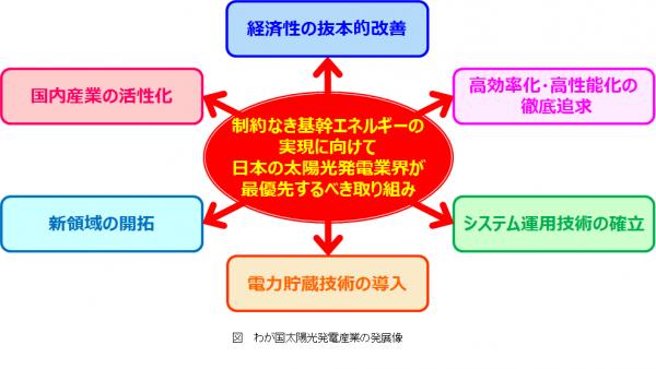 PV150では、経済性の抜本的改善、高効率化・高性能化の徹底追求、システム運用技術の確立、電力貯蔵技術の導入、新領域の開拓、国内産業の活性化への取り組みの加速によって、太陽光発電の制約なき基幹エネルギー化を進めていくことを今後の日本の太陽光発電産業の発展像として掲げています。