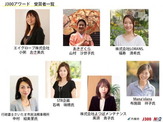 「J300アワード」は、全国の個性あふれる女性起業家を表彰する取り組みとして、今年度で4回目を迎えました。今年度も全国各地の個性あふれる女性社長を発掘すべく、各地の女性社長アンバサダーの協力のもと、全国約10カ所で「プレミアムミニJ300」を開催。2017年9月からエントリーを開始。公募、ミニJ300参加、女性社長による推薦を含め全国約212名が参加しました。2017年11月にノミネート者を19人に絞り、その後の女性社長アンバサダーによる選考や一般投票を経て、以下7名の受賞者が決定いたしました。