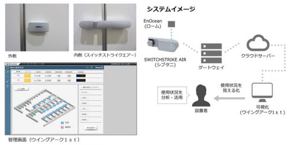 株式会社シブタニ(本社:大阪府大阪市)は、ローム株式会社(本社:京都府京都市)が提供する電池不要・配線不要の無線通信デバイス「EnOcean」を搭載したトイレの施錠・解錠情報を発信するスライドラッチ(トイレの施錠金物の専用受け)『SWITCHSTRIKE AIR(スイッチストライクエアー)』を開発し、ウイングアーク1st株式会社(本社:東京都渋谷区)と京都市の協力のもと、元離宮二条城での試験運用を開始したことを本日発表します。