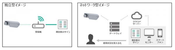 SWITCHSTRIKE AIRの活用イメージは、大きく独立型とネットワーク型に分かれます。独立型の場合、高速道路などでよく見られる満空表示などの看板に情報を出力することで、シンプルに利便性アップを図ります。ネットワーク型であれば、離れた場所からインターネットを介してパソコンやアプリ上で満空表示を見ることに加え、トイレの施錠時間、利用状況なども確認することができます。ソフトウェアサードパーティーと専用システムを構築することが必要ですが、情報をビッグデータ化し、さまざまな形で利用することが可能です。