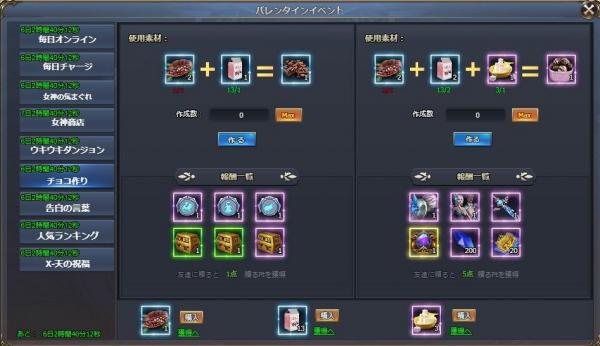 バレンタインイベント期間中、オンライン報酬やダンジョンより、チョコを作る為に必要な素材がドロップします。その材料を集めて、チョコを作ることができます。作ったチョコを仲間や友達にチョコを渡すと「Pt(ポイント)」を獲得できます。