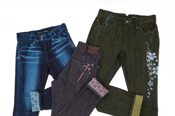 (春の新柄「桜の饗宴」の柄入れと抜染ビンテージ加工を施したジーンズ)