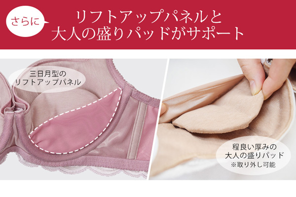 出産や授乳を経験した30代から40代の女性はバストが下垂する傾向があり、若い頃には感じなかったデコルテの悩みを抱える人が多くおられます。当商品は、そんな年齢を重ねたバスト特有の悩みを解消する「大人の盛りブラ」。日本では比較的珍しいバルコニータイプのブラジャーで、バストを下から持ち上げ、痩せたデコルテをグラマラスに演出してくれます。また、下垂で削げてしまったバストにボリュームを持たせ、お椀型に見せる「リフトアップパネル」や、柔らかくなったバストを優しく押し上げる「大人盛りパッド」など、実用新案を取得したこだわりの機能が満載(登録番号:第3214014号)。購入者からは「自分の胸に自信が持てるようになった」、「このブラを着けると、トップの位置も気分も上がる」と好評いただいています。