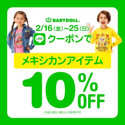 株式会社コージィコーポレーションが運営するベビー・キッズ服のBABYDOLL(ベビードール)がBABYDOLL(ベビードール)・STARVATIONS(スターベイションズ)各店、通販各店にて、2月16日(金)~25日(日)の10日間< LINEクーポン★新作メキシカンアイテム★10%OFF >を開催します。