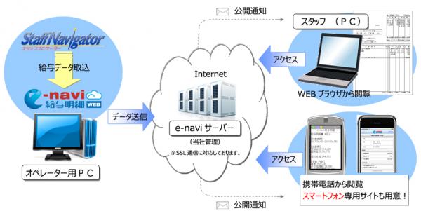 スタッフナビゲーターで作成した給与明細書を、派遣スタッフのパソコン・携帯電話・スマートフォンから専用ウェブサイトを通じて閲覧可能とするサービスです。