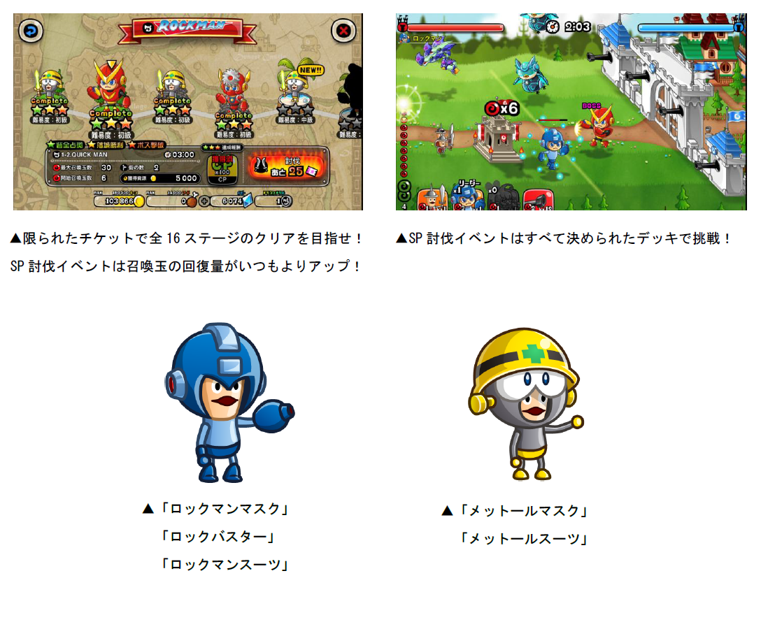 バトル内の「SP討伐イベント」から、「ロックマン」を使用してクリアを目指すコラボSP討伐イベント「ロックマンコラボSP討伐」に挑戦できます。1日3枚配布される「ひとりで」のチケット消費でのみ討伐に挑戦できます。SP討伐イベントは敵の城を落城させないとステージクリアとならない特別ルールとなっており、難易度「初級」から「上級」までの全16ステージ中、1日2ステージずつ解放されます。また、本SP討伐イベントは、各ステージごとに、決められたデッキで挑みます。「ロックマン」を使いこなし、ステージクリアを目指しましょう!