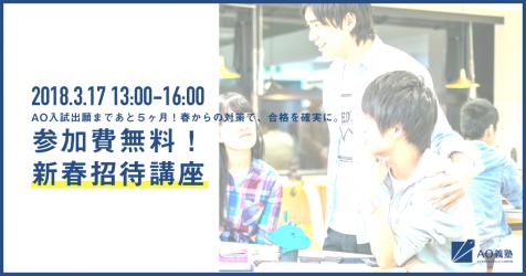 本講座では、AO入試についての基本的情報から、志望理由書の書き方まで、AO入試を受験するときに絶対知っておきたい「受験のイロハ」をお伝えします。この「イロハ」を知っているかどうかで、AO入試本番までの過ごし方が大きく変わってきます。ご受講後も、AO義塾で対策して合格に向けて強力なスタートダッシュを切りたいという方のために、3月24日~26日・29日~31日実施の春期講習や、AO義塾の料金・受講システムについても詳しい説明がございます。「有料の講座の前に、まずは話だけ」という方も、お気軽にお越しくださいませ。