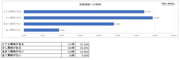 自動運転への興味を聞いたところ、「自動運転に興味がある人」は66%。そのうち、「とても興味がある人」は32%、「少し興味がある人」は34%となり、「全く興味がない人」は、わずか9%という調査結果となりました。