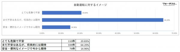 自動運転に対するイメージは、全体的に期待が大きく、「まだ不安はあるが将来的に期待する人」は64%、「安全・便利なイメージで今から期待する人」が15%、「とても危険で不安なイメージという人」は20%という調査結果となりました。