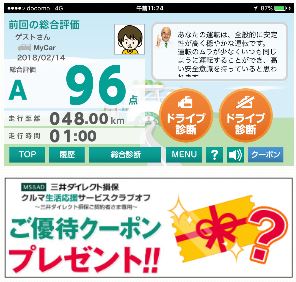 「ムジコロジー・ドライブ」で提供している「ドライブ診断」で80点以上を出した場合に、クルマ生活応援サービスのお試しとしてご好評のクーポンを発行します。ドライブ診断はドライブレコーダー機能を使い、運転の傾向を診断・採点することや、運転状況を記録・確認することで、より安全な運転をサポートします。運転結果をもとにした運転総合アドバイスもあるので、普段は気づかない、運転の癖を知ることもできます。