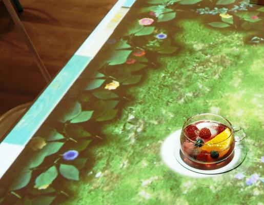 施設のテーマは“秘密の本の中に閉じ込められた不思議な森”。アンティークな“飛び出す絵本”のような入口の先にある8席の小空間には“絵本の世界”に入り込んだような非日常の演出が施されており、3月中旬からは注文した飲食を “棚に並ぶ本”の中から受け取るなどのギミックも導入いたします。(※2)店内のテーブルには本の世界が映し出され、お客さまの動きに応じて花が咲く、鳥が飛び去るなど映像が変化し、ファンタジックな空間で飲食をお楽しみいただけます。