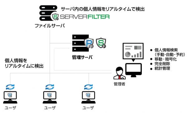 SERVERFILTERはWindowsサーバに保存してある個人情報(マイナンバー、メールアドレス、電話番号、クレジットカード番号、名字、住所、年金番号、免許証番号、任意のキーワードなど)を自動的に探し出し、どれくらいの個人情報を保有しているかについて簡単に可視化し、ファイル移動、暗号化、完全削除などの個人情報管理をサポートします。