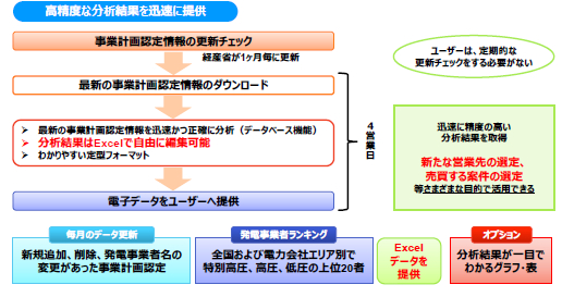 本サービスは、経済産業省・資源エネルギー庁が公開する事業計画認定情報*を加工し、迅速かつ正確に分析したデータを定期的に提供するものです。膨大な認定情報から、新たに追加された案件や変更された案件を抽出することに加えて、認定情報を集約することで電力会社エリア別でのランキングも完成させました。この分析結果は、太陽光発電事業の発展に取り組まれる皆様に役立つよう、すぐに使える実践的な電子データとして提供致します。電子データは自由に編集可能であり、新たな営業先の選定や売買する案件の選定等々さまざまな目的で活用することが可能です。