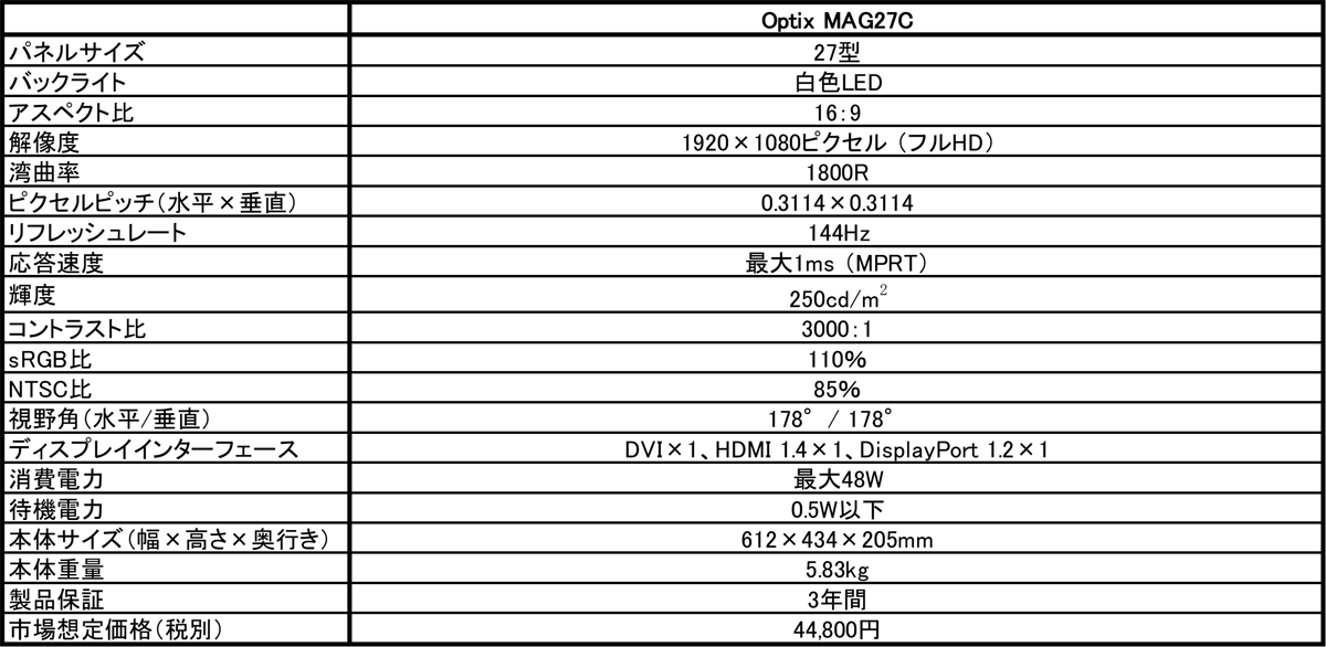 本製品は、2560×1440ピクセルのWQHD表示に対応したOptix MAG27CQの下位モデルにあたり、曲率1800R(半径1800mmのカーブ)の湾曲タイプの27型VAパネルを採用し、144Hzの高リフレッシュレート表示と、最大1msの応答速度を実現。ディスプレイ入力にはDVI、HDMI、DisplayPortの3系統をサポートし、視野角は178°のワイドビューアングルに対応。薄型ベゼルの採用により、マルチディスプレイ環境において、よりシームレスな視野を得ることが可能です。また、液晶スタンドは高さや角度の調整範囲を増やしているほか、VESAマウントにも対応し、市販のアームとの組み合わせによって、より柔軟な設置ができます。