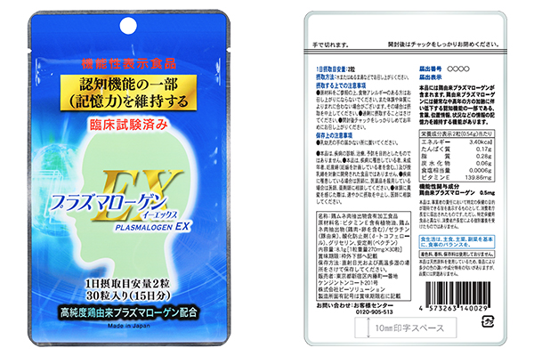 株式会社ピーソリューション(本社:東京都新宿区、代表取締役:大島健嗣 http://www.p-sol.co.jp)は「鶏由来プラズマローゲン」を配合した「認知機能の一部(記憶力)を維持する」機能性表示食品「プラズマローゲンEX」を3月1日から、web通信販売を含め、販売を開始します。
