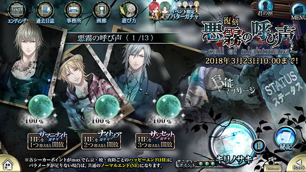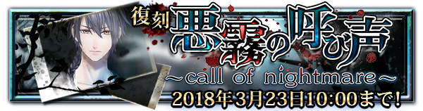 株式会社エレメンツリー(代表取締役:小川 邦弘、所在地:大阪市淀川区)は、2018年2月23日にホラーBLゲーム『チギリバコ』(CV.四ツ谷サイダー、鳩マン軍曹etc)3月イベント「[復刻] 悪霧の呼び声」の提供を開始しました。