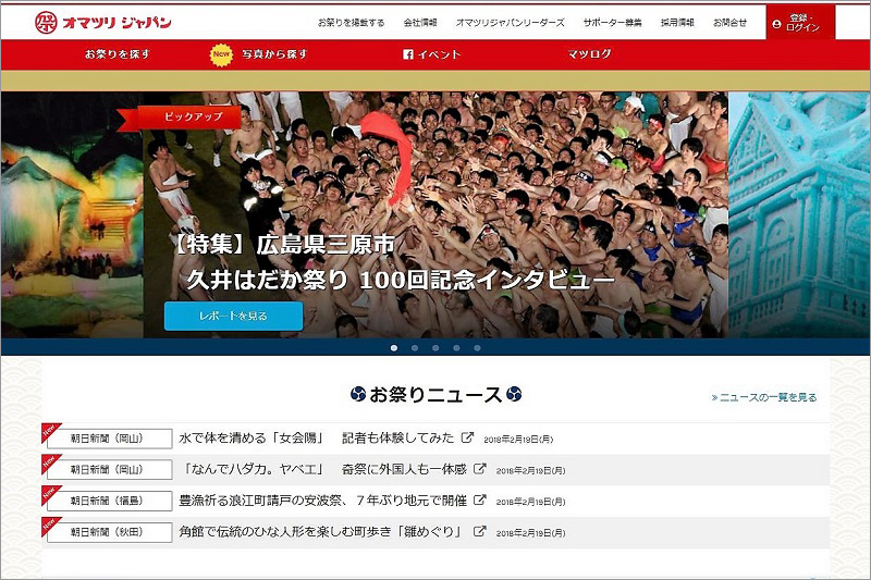 オマツリジャパンは 2014 年に創業し、「祭りで日本を盛り上げる」を理念に、お祭りに関するサポートサービスを進める日本初のお祭り専門会社です。主にお祭りのプロデュース、ツアー企画、お祭りを活用したプロモーション、WEB プラットフォーム等を通じて全国の祭主催者や自治体、地元企業と様々な取り組みを進めています。