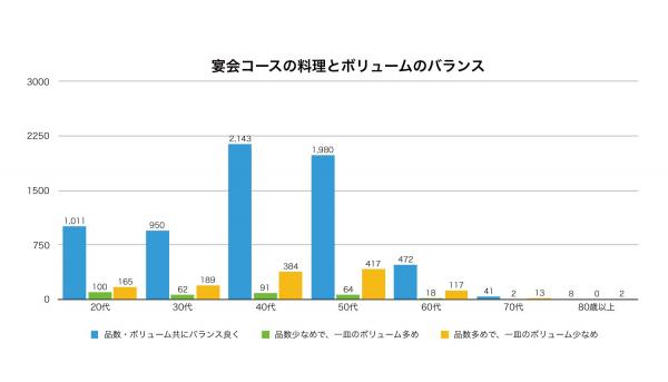 その他、予算は3,000円から4,999円までが全体の84.4%を占め、コース料理の品数とボリュームについては、「バランス良く」が80.2%、宴会時の平均人数は5~10名が66.3%に上りました。