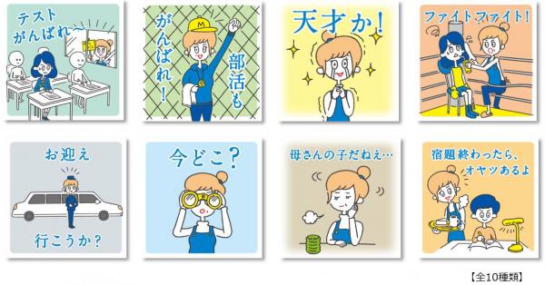 なかなか素直に伝えることができないことも多い我が子への応援メッセージを、ちょっとユニークであたたかな母親のイラストで表現しました。様々な生活シーンに対応したメッセージスタンプ画像は全部で10種類。メールやLINE等のメッセンジャーアプリにご利用可能です。新入学・新学年と新たな環境に進んでいくお子さまの応援に是非ご利用ください。