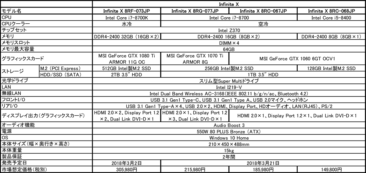 2018年3月1日 - Micro-Star International Co., Ltd. 台湾・新北市 - GAMING向けハードウェアの設計で世界をリードするMicro-Star International(MSI)は、開発コードネーム"Coffee Lake"こと、第8世代Intel Coreプロセッサを採用したGAMINGデスクトップPC「Infinite Xシリーズ」4製品を3月2日より順次発売いたします。