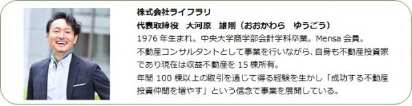 不動産投資事業を展開する株式会社ライフラリ(本社:東京都中央区、代表取締役:大河原雄剛)は、売買仲介を事業の中心に2014年に設立し、代表自身の不動産投資経験をもとに「普通のサラリーマンが自分に合った不動産投資で成功する」ことを1番に考え、事業を行っています。