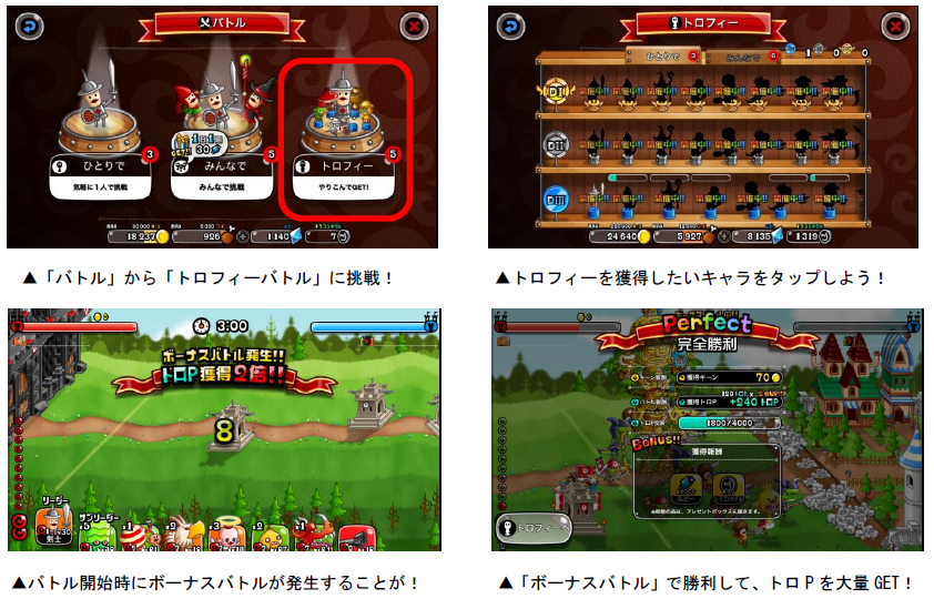 各キャラのトロフィーは、「トロP」を一定数貯めると獲得することができます。トロPは「キャラのLvが20以上」「うまP200以上」など、各キャラによって異なる条件を満たした状態でバトルを行なうと獲得できます。また、バトルを開始すると「ボーナスバトル」が発生することがあり、バトルの勝敗に関係なく、獲得トロPが2・3・5・10倍のうちいずれかの倍率で増加します。ボーナスバトルが発生したら、勝利してトロPの大量獲得を目指しましょう!