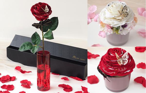 当社のプロポーズ商品を購入されたお客様の平均購入単価は約3万円(2018年2月実績)。この度発売した3アイテムは、毎年のご結婚記念日やお誕生日プレゼントにご購入しやすい価格帯として、プロポーズ商品単価の半値にあたる1.5万円のご予算で購入できる商品としてご提供致します。3商品いずれもバラの花びらに「Anniversary(記念日)」や「To Saki(名前)」を入れることができ、記念日に女性に贈るギフトとして最適なデザインでお届け致します。