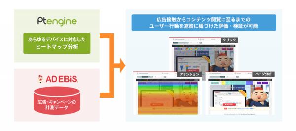株式会社Ptmind(本社:東京都渋谷区 代表取締役社長:鄭 遠)はヒートマップ付きアクセス解析ツール「Ptengine」と株式会社ロックオン(本社:大阪府大阪市北区 代表取締役:岩田 進)のマーケティングプラットフォーム「アドエビス」の連携を2018年3月6日より開始することを発表します。
