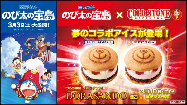 株式会社ナムコ(本社:東京都港区/社長:萩原 仁)と、コールド・ストーン・クリーマリー・ジャパン株式会社(本社:東京都中央区/社長:難波 一康)は、「映画ドラえもん のび太の宝島」(2018年3月3日(土)公開)とコラボしたアミューズメント向けアイス景品「DORASANDO どらサンド」(以下、どらサンド)を企画開発し、2018年3月10日(土)からナムコのゲームセンター限定のクレーンゲーム景品として導入いたします。