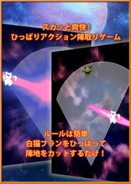「スペース カット モンスター」は宇宙を舞台に一匹のかわいい野良猫が奔走するひっぱりアクション陣取りゲームです。ネコをひっぱって図形をカットするという誰もが楽しめるシンプルな操作性に加え、100にもおよぶステージとそこに現れる個性豊かなモンスターの動きを読んで攻略する奥の深さもゲームの特徴です。ランキングで他のプレイヤーとスコアを競い合うことも可能です。