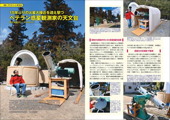 第1特集はビクセンの屈折望遠鏡SDシリーズと話題のSDレデューサーHDキットをレビュー。口径81mm、103mm、115mmの3種のSD鏡筒+SX2赤道儀で撮影した星雲星団写真をカラーページで紹介します。第2特集は1月31日に見られた皆既月食をとらえた写真と動画をグラフィカルに紹介します。HDR撮影でとらえた部分食~皆既食の経過、高感度特性に優れた一眼カメラでとらえた動画などを紹介。ほか、7月の火星大接近に備えるベテラン惑星観測家の観測スタイル、天文ガイド読者がカメラマンとなり撮影した動画がいよいよ一般公開開始となった、野辺山タイムラプスムービープロジェクトの模様など、盛りだくさんの内容です。