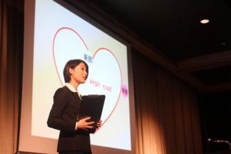 プレゼンテーションでは、共働き等で忙しい現代人カップルをテーマにした「てのひら婚」が、企業様の投票で見事1位に輝きました。仕事の多様化により二人の休日が合わないカップルに向けて「アプリ」を使って、ドレスやお花選びができたり、相談が必要な場合は、LINEを使ってウエディングプランナーと連絡が取れるといったスマホを使って、“てのひら”で結婚式までの段取りができるという斬新なアイディアを発表しました。時代の流れを組んでいて、発想がおもしろい!と企業様からも好評化をいただきました。