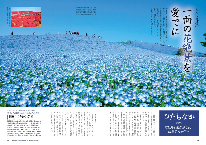 ◆一面の花絶景を愛でに(ひたちなか・茨城)、◆水辺の絶景を求めて(吹割の滝・群馬)、◆お手軽ハイキングで山絶景(筑波山・茨城、昇仙峡・山梨)、◆非日常な空間へ(宇都宮、大谷・栃木)、◆大人のものづくり体験(鎌倉)